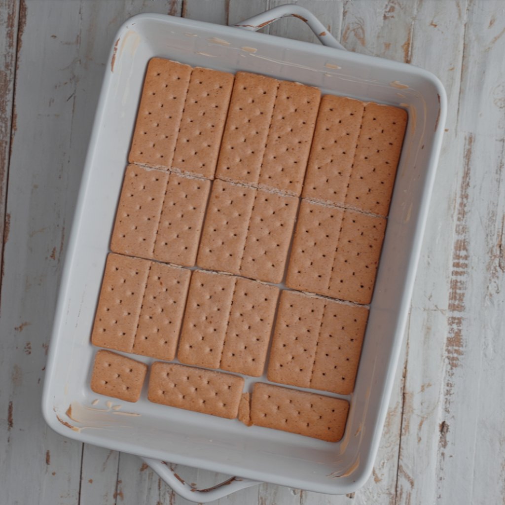 Arrange a single layer of graham crackers on the bottom of a 13×9-inch baking dish, breaking pieces as needed to cover fully. - Step 3: Spread the Pudding Magic