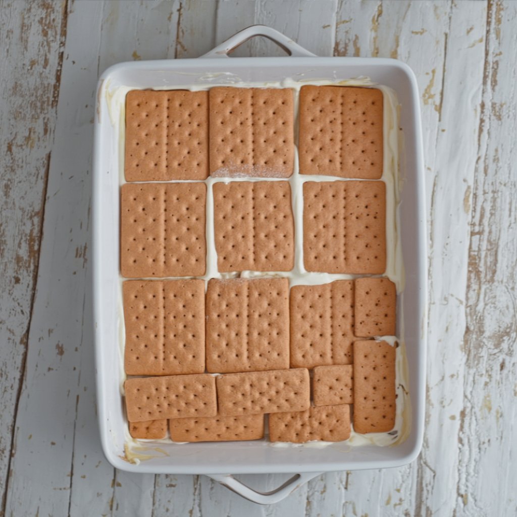 Arrange a single layer of graham crackers across the bottom of a 13×9-inch baking dish. You might need to break some crackers to fit them snugly into a solid layer. This foundation is the key to the cake’s structure.