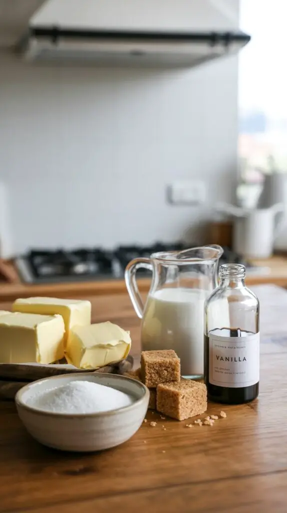 - Vanilla sauce: In a saucepan combine butter, granulated sugar, brown sugar, and heavy cream. Simmer 3–5 minutes, whisking until smooth and slightly thickened. Remove from heat and stir in vanilla.