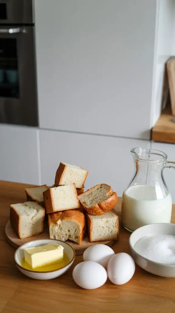 - 8–9 cups day-old bread, cubed (Challah or brioche preferred)
