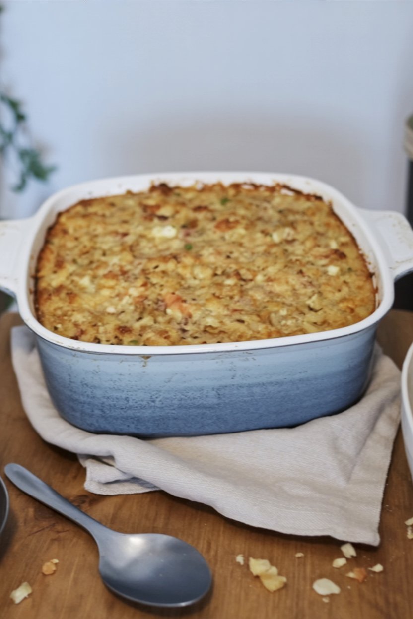 - Bake: Transfer the mixture to the prepared dish. Spread evenly, but do not press down firmly (this keeps the top textured). Bake uncovered for 45 to 55 minutes, until the top is deeply golden brown and the center is set.