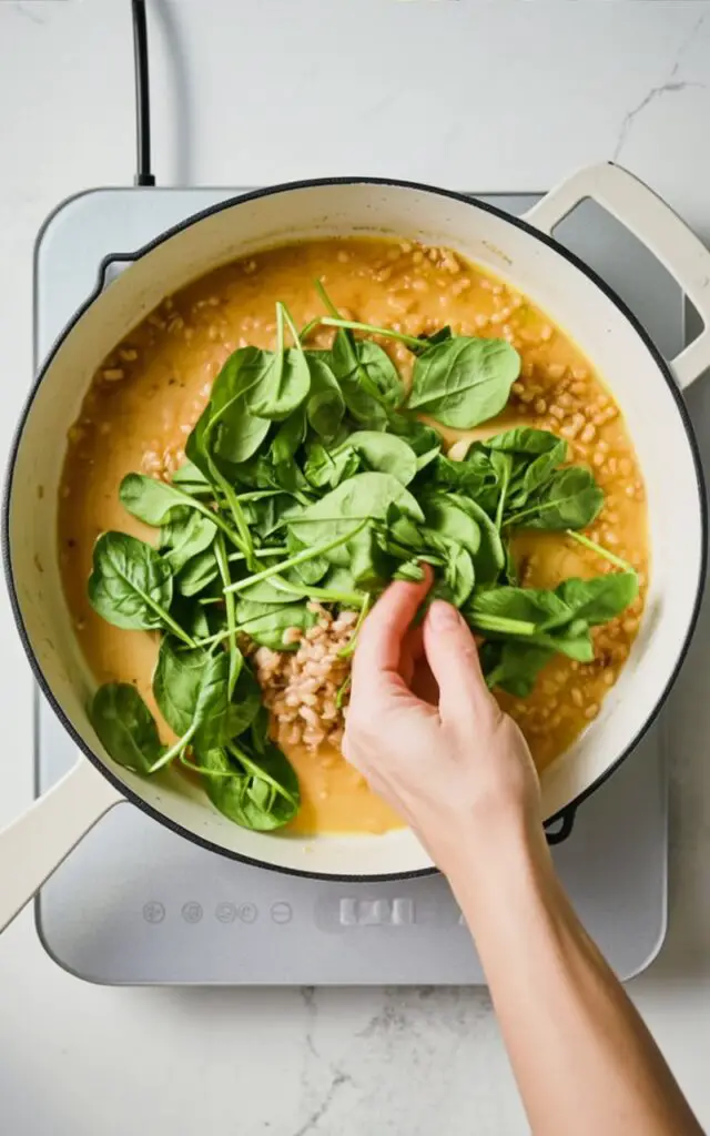 - Wilt spinach: Add spinach in batches, stirring until fully wilted, 3–5 minutes.