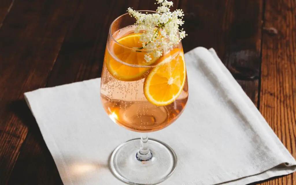 Use dealcoholized orange wine and elderflower cordial, then top with soda or sparkling water. Expect ~40 kcal versus 130 kcal in the original.