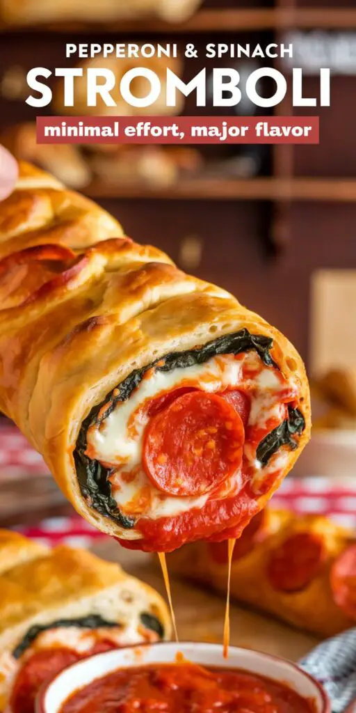 Why not gather your dough, pepperoni, and spinach next time you’re short on time but not on appetite? Roll it, bake it, and enjoy that first slice oozing with melted cheese. Once you’ve savored the results, come back here and share your personal variations—did you tuck in extra veggies, add a swirl of pesto, or dust it with parmesan and herbs on top? Your imaginative approach might spark other home cooks to expand their stromboli horizons, proving that creativity and convenience can coexist in a single dish.