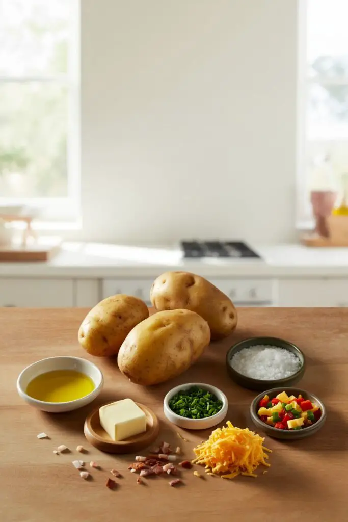 | Optional Toppings | As desired | Butter, sour cream, chives, shredded cheddar, bacon bits. |