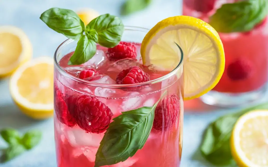 - Garnish: Float lemon slices, extra raspberries, basil leaves for visual appeal.