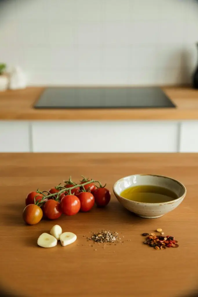 - Season & Roast: In a baking dish, toss tomatoes with olive oil, sliced garlic, black pepper, chili flakes, kosher salt, and dried thyme. Roast 30 minutes until skins wrinkle and many tomatoes burst, releasing juices.