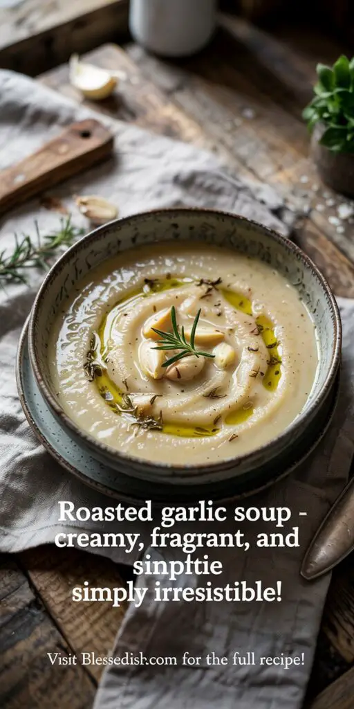Serve your Roasted Garlic Soup in rustic, deep bowls that highlight its creamy, velvety texture and rich, caramelized flavor. A drizzle of extra virgin olive oil or a light sprinkle of freshly ground black pepper can add an extra touch of indulgence. This soup pairs wonderfully with a slice of crusty bread or a simple side salad, making it perfect for a cozy lunch or a comforting dinner. Consider pairing it with a glass of crisp white wine for a refined, satisfying meal.
