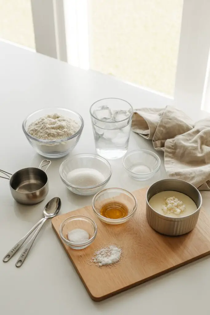 - Combine Dry Ingredients: In a large bowl, stir together the flour, sugar, and salt. In a separate small cup, combine the ice water and apple cider vinegar.