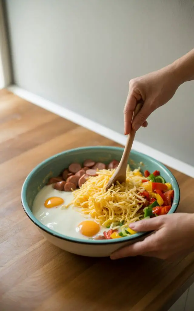 In a large mixing bowl, combine the thawed hashbrowns, diced onion, red and green bell peppers, the cooked sausage, and only ½ of the cheese (1 cup). Use a large spoon to mix these ingredients until they are evenly distributed.