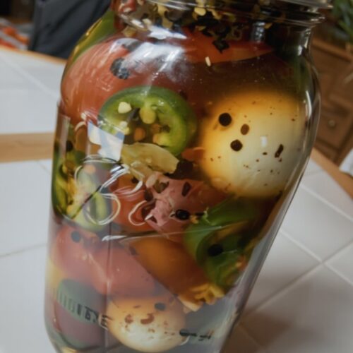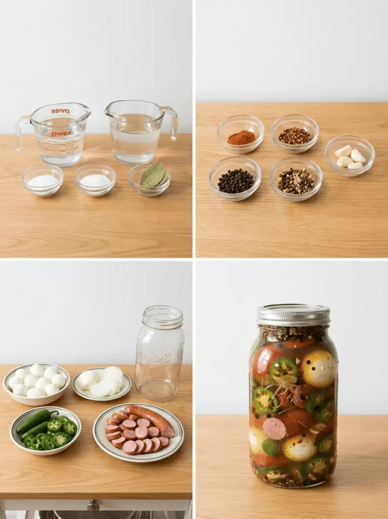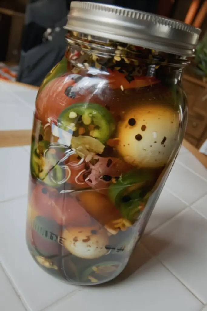 - Layer the Jar: In a clean half-gallon Mason jar, layer ingredients: onions/garlic at the bottom, followed by jalapeños, Kielbasa, and eggs. Repeat the pattern until the jar is packed full.
