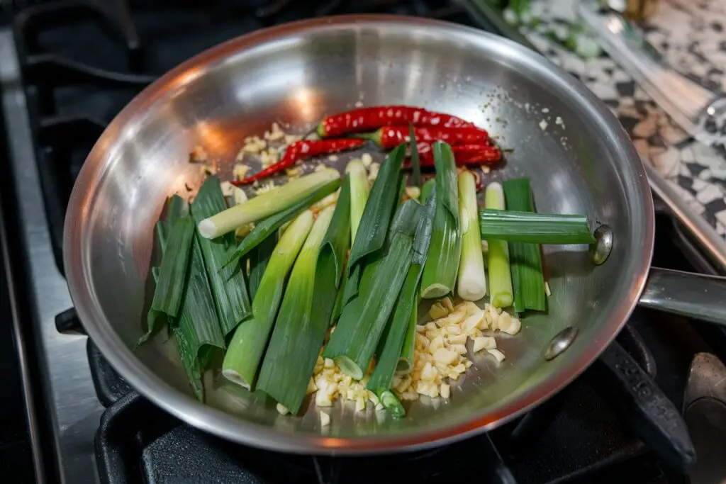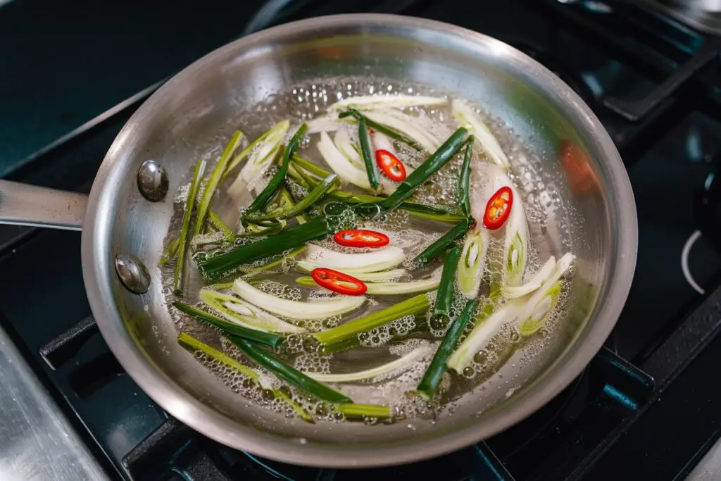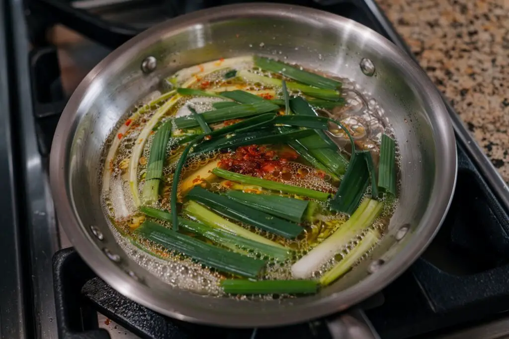 While the okra cools, it’s time to create the soul of our Sichuan okra salad: the infused oil. In a small saucepan, heat the vegetable oil over medium-low heat. Add the scallions, minced garlic, star anise, and cinnamon stick. Let these aromatics gently sizzle and infuse the oil for about 10-12 minutes, or until the scallions are golden brown and the garlic is fragrant. Be careful not to burn the garlic.