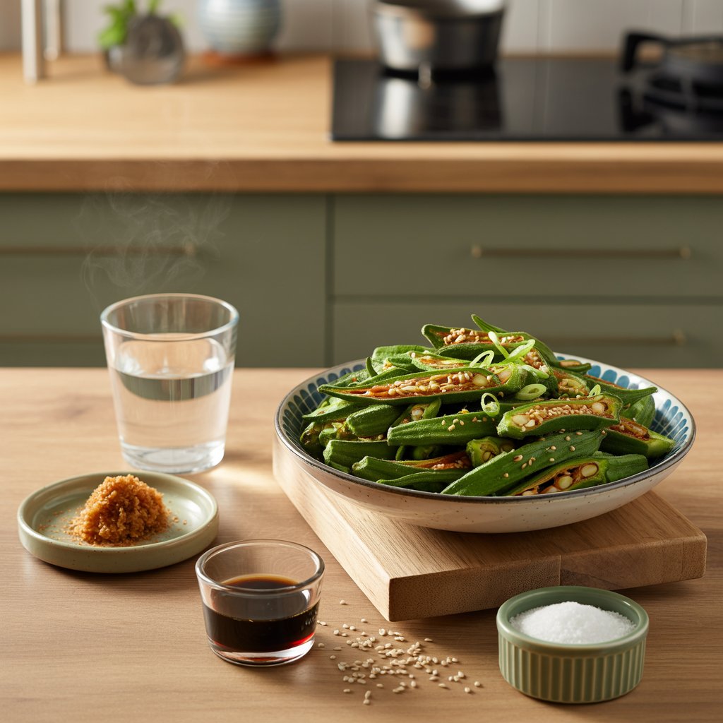 - Add okra, sprinkle with ½ tsp salt, and stir-fry 4–5 minutes until pods are bright green and just tender. Remove from heat.