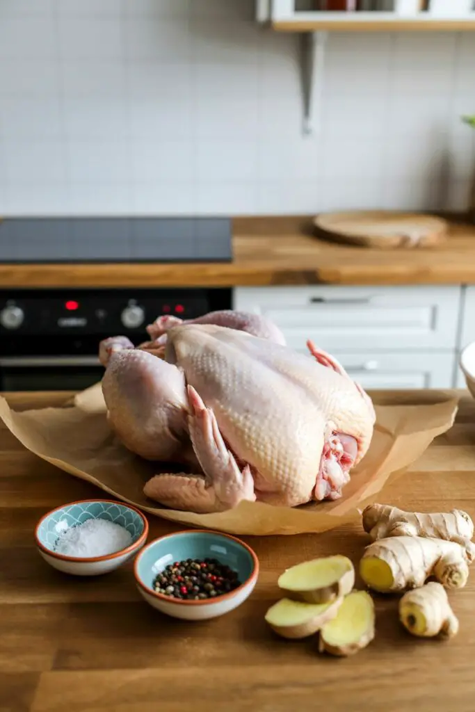 - Season and Stuff: Season chicken generously inside and out with salt and pepper. Tuck wingtips back. Stuff the cavity with the reserved spent peels and 6 slices of ginger. Tie legs together.