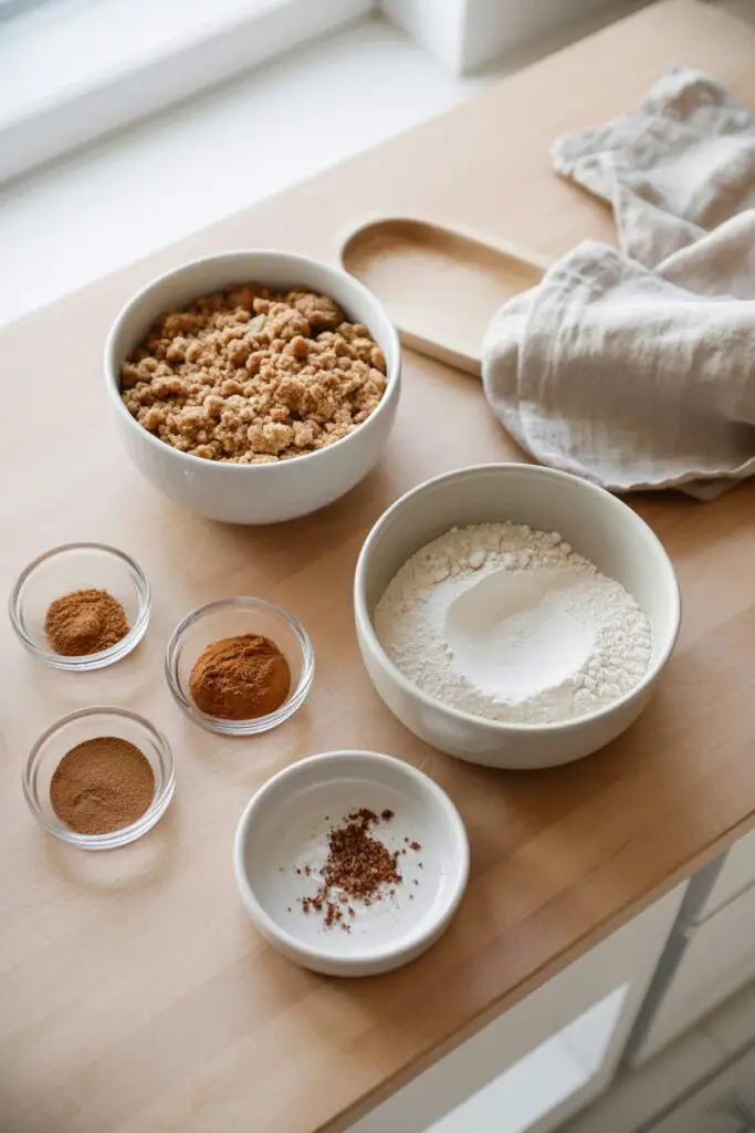 - Prepare Topping: In a medium bowl, whisk ¾ cup brown sugar, flour, cinnamon, pumpkin pie spice, and nutmeg. Cut in the cold butter until the mixture resembles coarse, dry oatmeal. (Stir in optional crushed ginger snaps here).