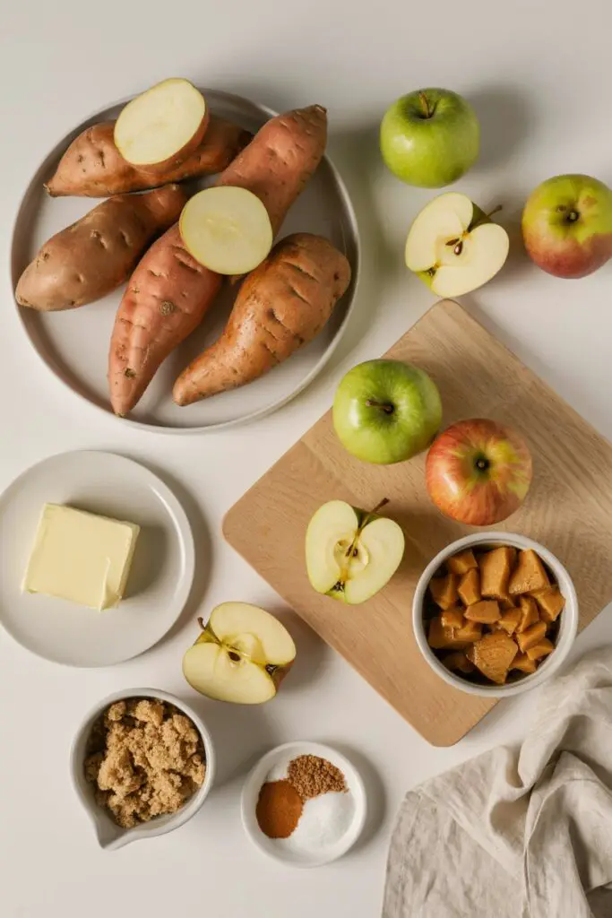 - Assemble: Peel and slice cooled sweet potatoes into rounds. Grease a 9×13 inch baking dish. Arrange half the potato slices in the bottom. Top with the apple mixture. Add the remaining potato slices as the final layer.