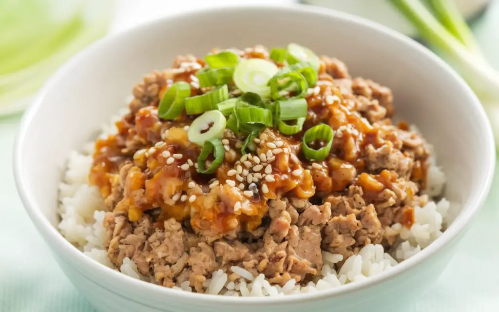 - Ladle or spoon the turkey-veggie mixture onto a bowl of warm rice. Garnish with sliced green onions, sesame seeds, or a drizzle of sriracha if you want a spicy note.