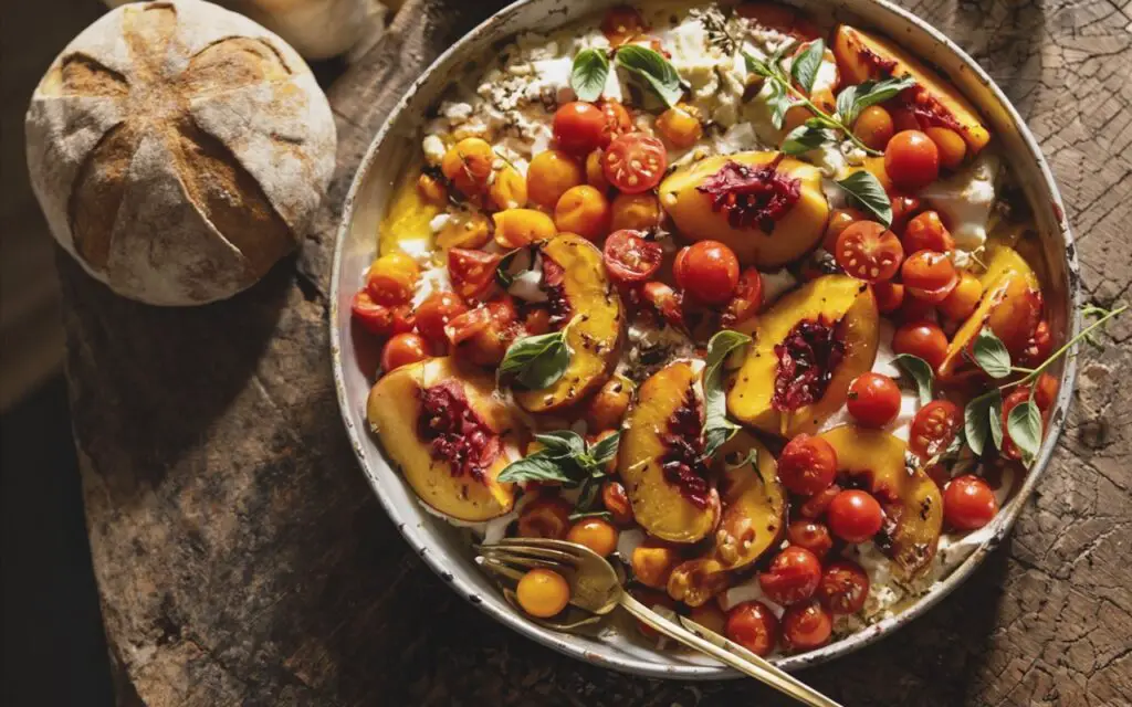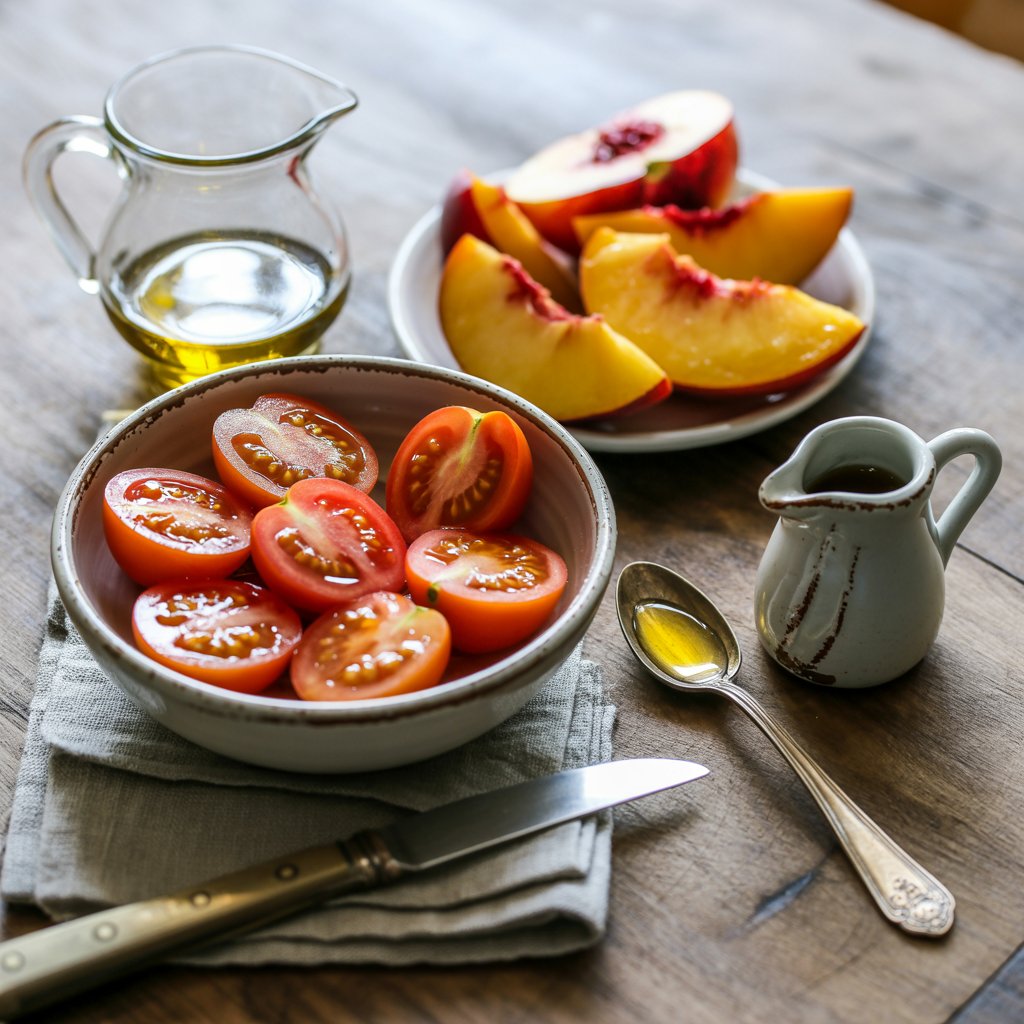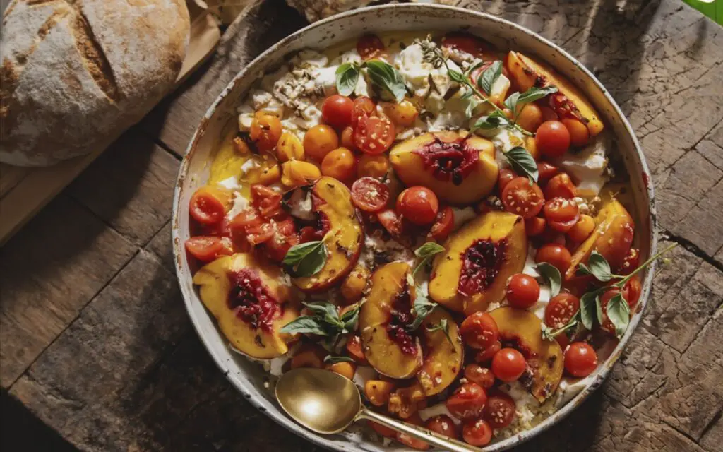 - Roast fruit: Preheat oven to 450°F (232°C). On a baking sheet, combine peach wedges and half the cherry tomatoes with olive oil/butter, honey, thyme, salt, pepper, and chili flakes. Toss to coat and roast 15–20 minutes, until tomatoes burst and peaches caramelize.