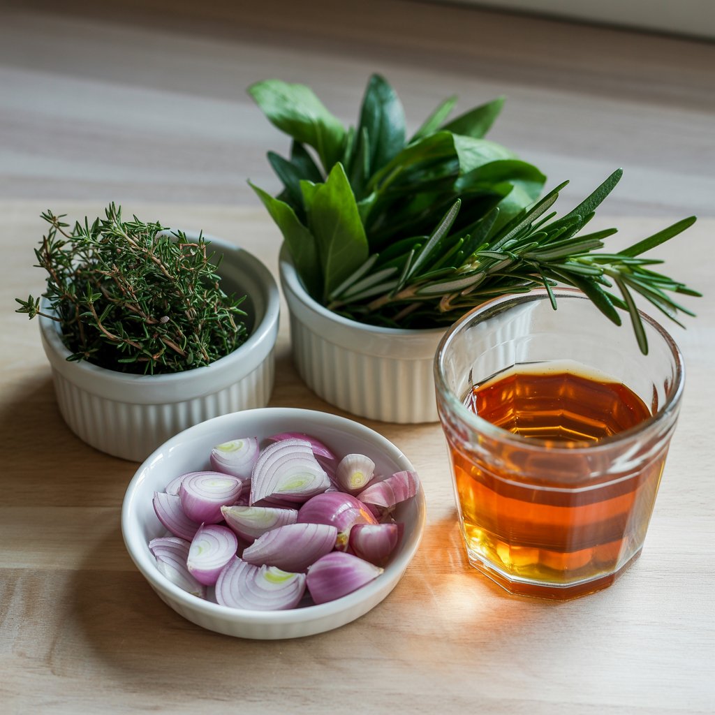 | Shallot, Rosemary, Thyme | 1 shallot, 1 tbsp rosemary, 1 tbsp thyme, all chopped – The aromatic trio that infuses the warm butter with incredible flavor. | |