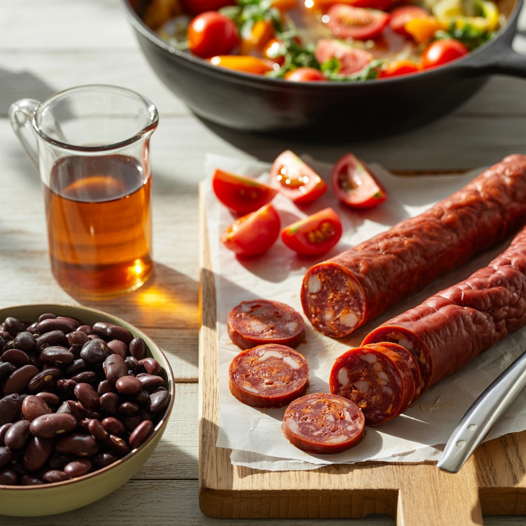 - 8 oz Spanish-style chorizo sliced (Spicy, smoky pork sausage)