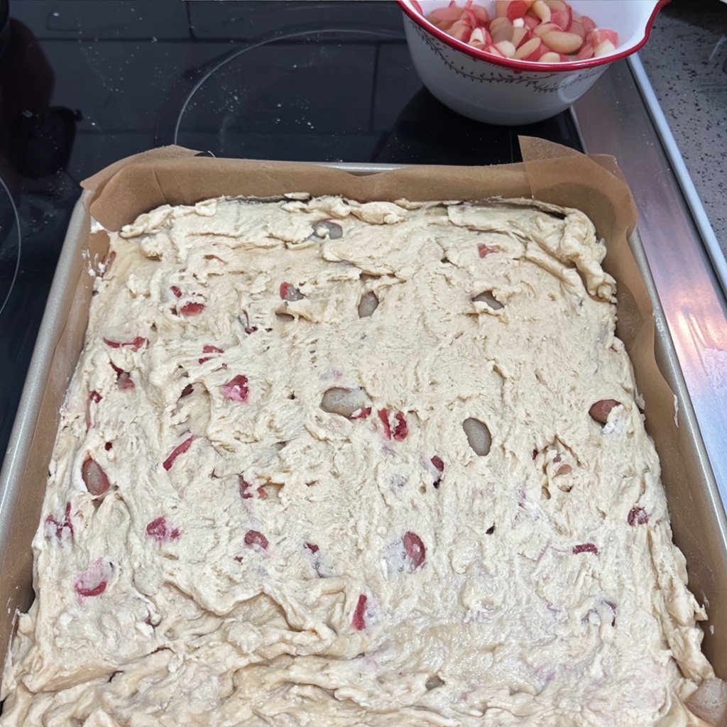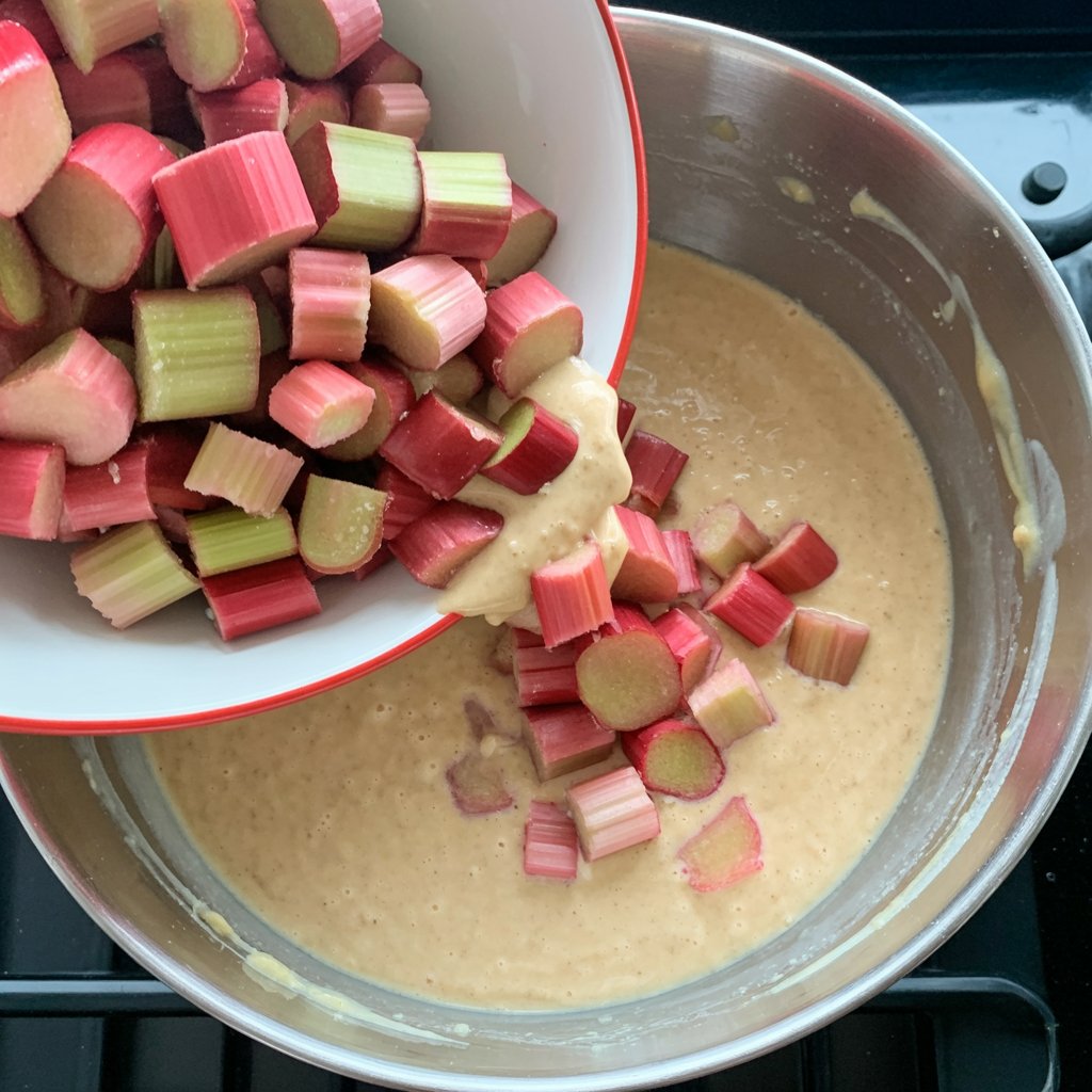Gently fold most of the chopped rhubarb into the cake batter, saving a small handful to sprinkle on top. Scrape the batter into your prepared tin and use a spatula to level the surface. Sprinkle the reserved rhubarb pieces over the top.