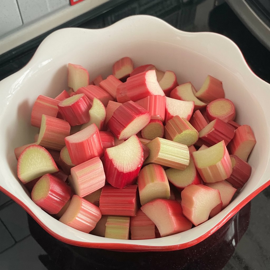 - Wash, trim, and slice rhubarb into 1 cm pieces. Reserve a small handful for the topping.