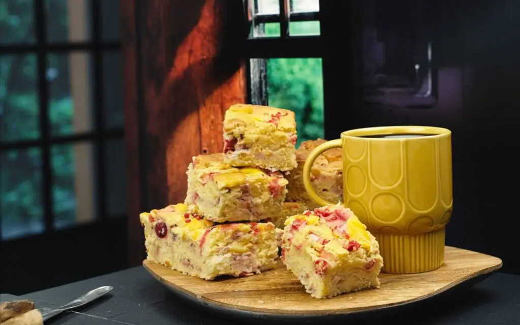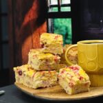 - Cool in the tin on a wire rack for 20–30 minutes to allow custard pockets to set.