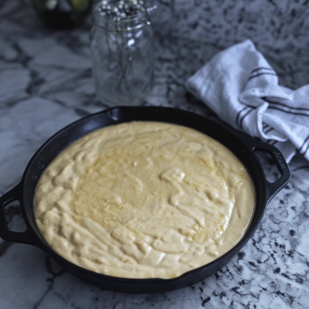 Using sturdy oven mitts, carefully remove the hot skillet from the oven. Pour the cornbread batter directly into the hot skillet—it should sizzle! Place the skillet back in the oven and bake for 30-35 minutes.