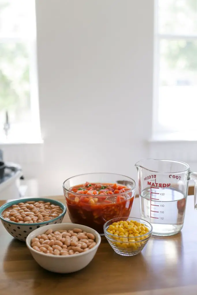 - Combine Ingredients: Place a large soup pot over medium heat. Add the rinsed beans, the undrained tomatoes (juices included), the drained corn, and the water.
