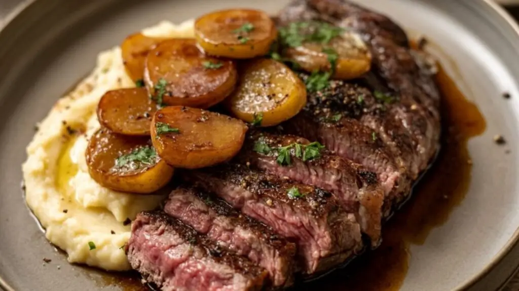- Plating: Create a generous “swoosh” of the potato puree across the plate. Fan the sliced steak against it. Place a perfect spoonful (a quenelle, if you’re feeling fancy) of the cipollini onion marmalade next to the steak.