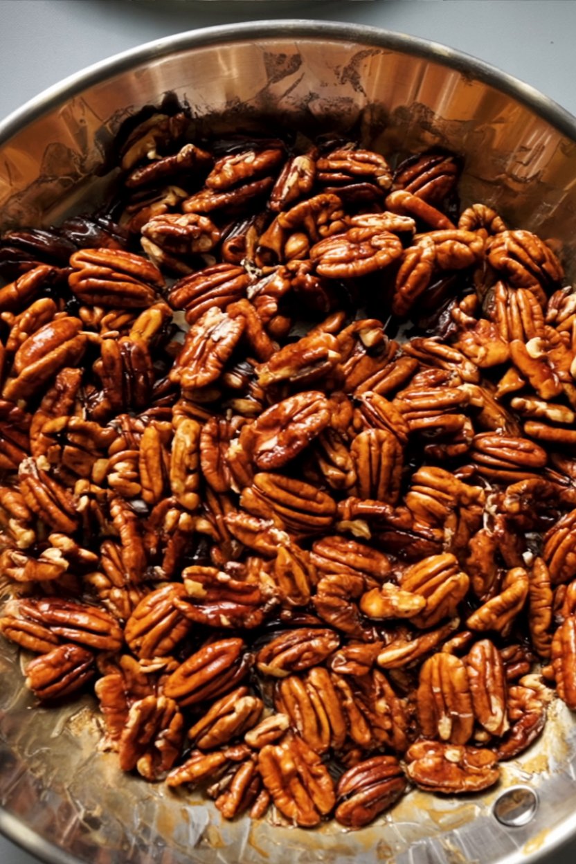 - Make the Caramel Sauce: In a medium saucepan over medium heat, combine the butter, brown sugar, and chopped pecans. Cook, stirring constantly, until the butter is melted and the mixture comes to a soft boil.