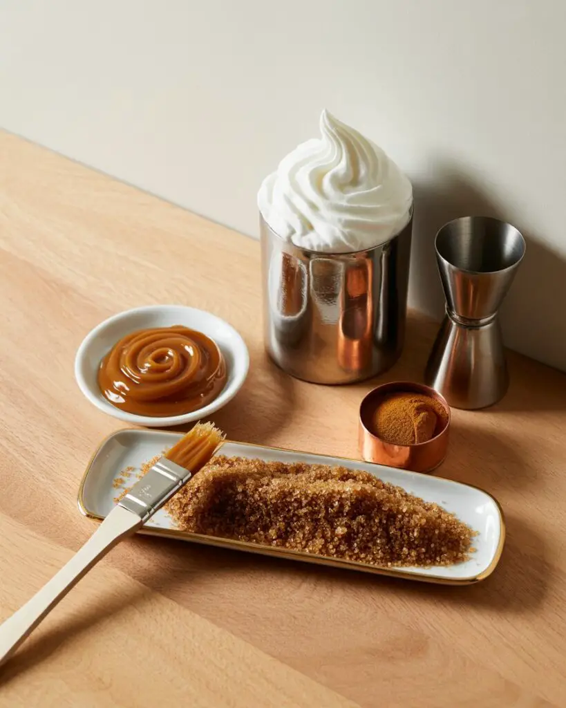- Prepare Your Cocktail Glass: Pour a small amount of caramel sauce onto one small plate and dark brown sugar onto another. Gently dip the rim of a martini glass into the caramel, then dip the caramel-coated rim into the brown sugar until fully coated.