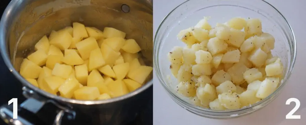 Fill a medium pot about halfway with cold water. Add 1 teaspoon of the salt and the secret weapon: the ¼ teaspoon of baking soda. Add your potato chunks to the pot. Bring the water to a boil and cook for 6-8 minutes. You’re not trying to cook them through; you just want them to be slightly tender on the outside (a paring knife should meet some resistance in the center).