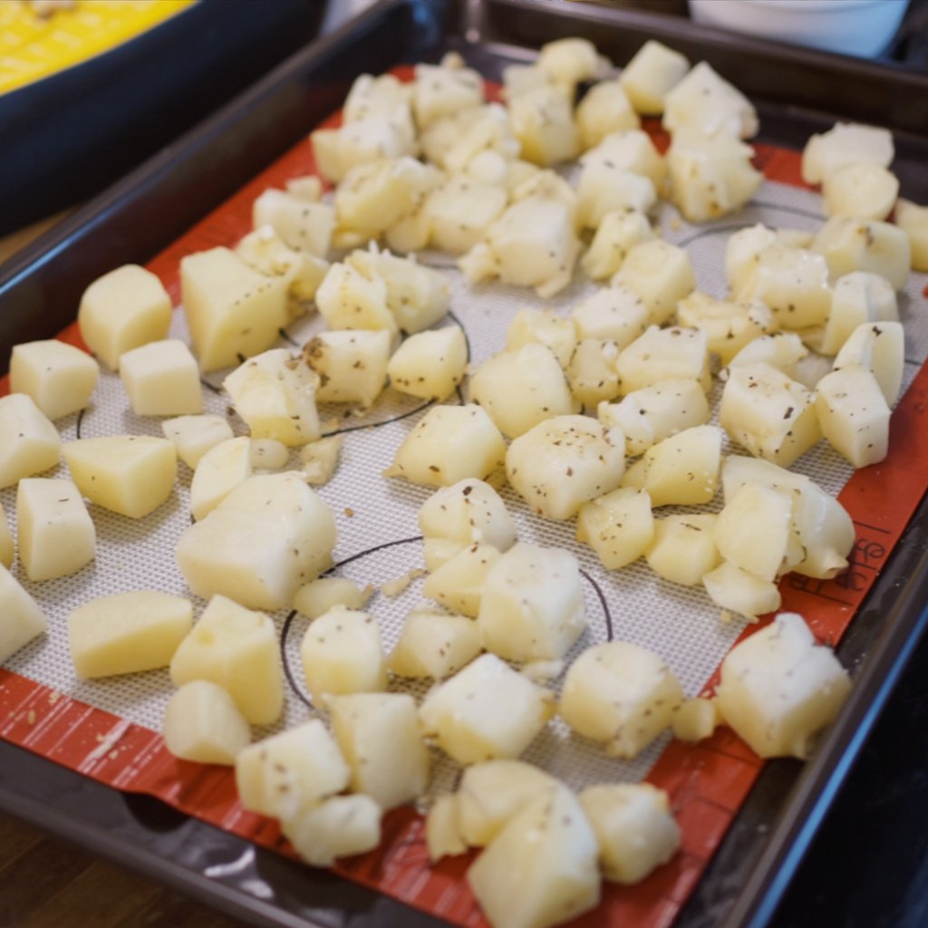 - Preheat & prep: Heat oven to 425°F (215°C). Peel potatoes and cut into uniform 1–2 inch chunks.