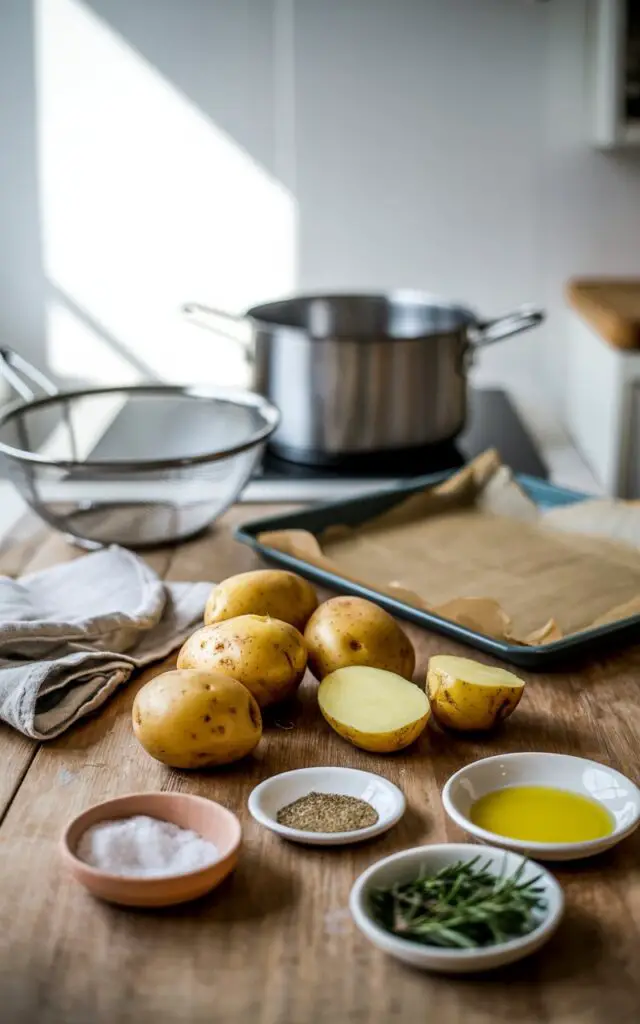 - Parboil scientifically: In a pot, add cold water, 1 tsp salt, and 1/4 tsp baking soda. Add potatoes and bring to a boil. Cook 6–8 minutes; centers should still resist a knife.