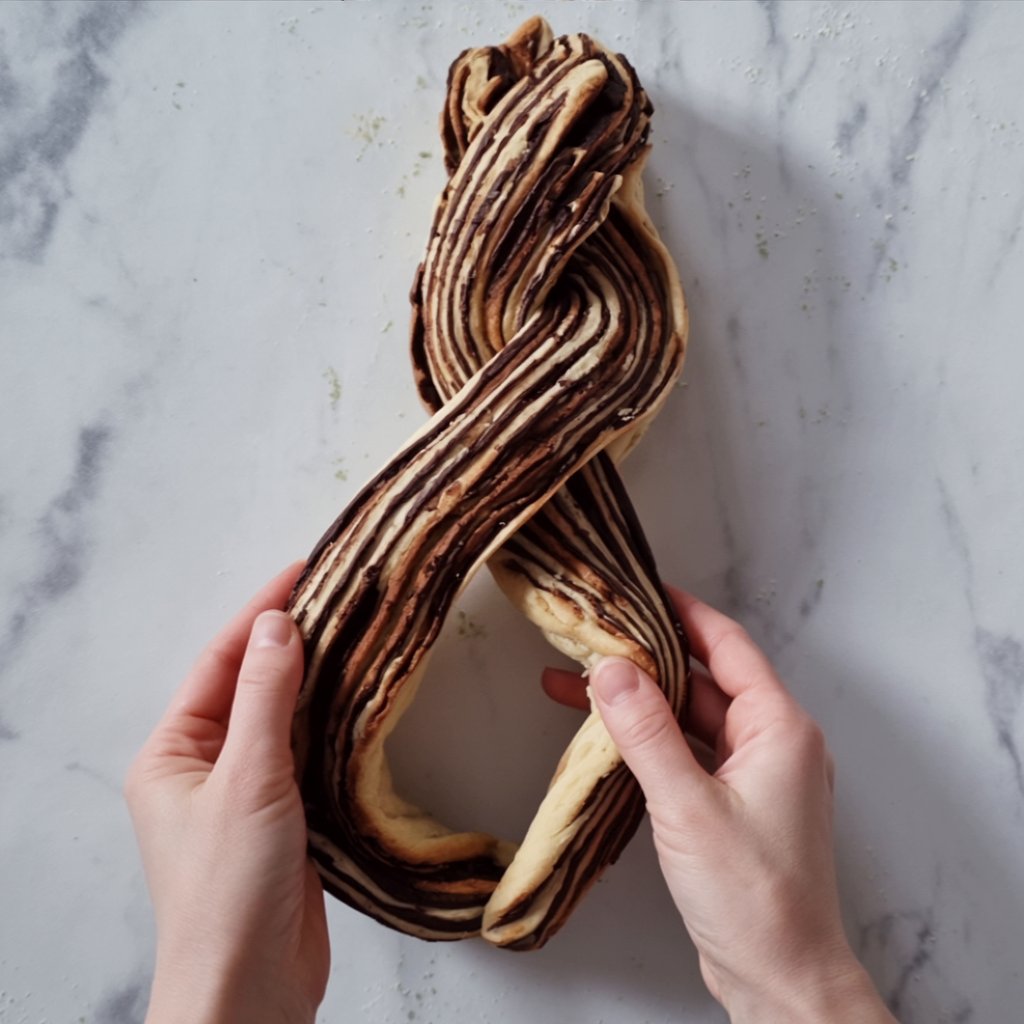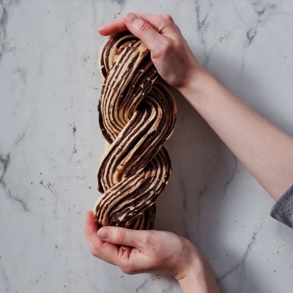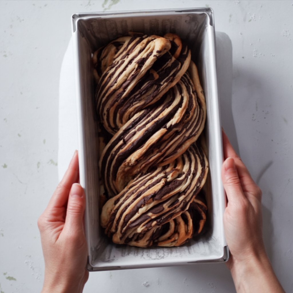 Starting from a long edge, roll the dough up tightly into a 12-inch log, placing it seam-side down. Using a sharp, lightly oiled serrated knife, carefully slice the log in half lengthwise. Turn the two halves so the cut, layered sides face up. Gently twist the two strands around each other to form the classic babka braid. Carefully lift and transfer the braided loaf into your prepared tin, gently squishing the ends if needed to make it fit.