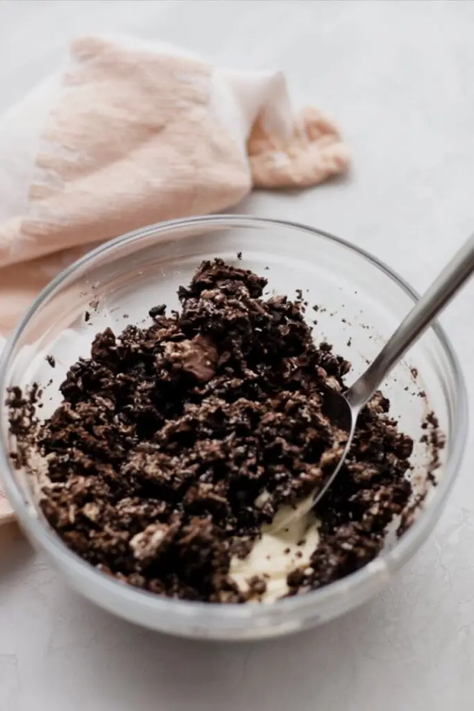 In a food processor or blender, pulse the 10 Oreo cookies (filling and all) until they form coarse crumbs. You can leave some larger chunks for extra crunch. Pour the crumbs into a bowl and mix them with the melted butter until evenly moistened. Set this mixture aside.