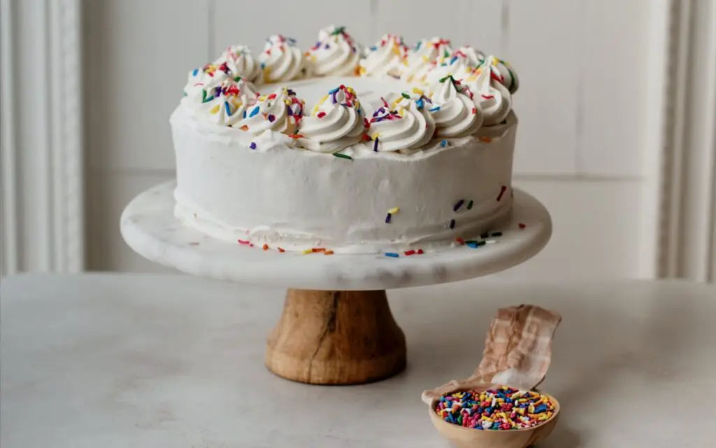 When you’re ready to serve, make the whipped cream. Using a stand mixer with a whisk attachment or a handheld mixer, beat the cold heavy cream, confectioners’ sugar, and vanilla on medium-high speed until stiff peaks form, about 4 minutes. Remove the cake from the freezer and release the springform pan’s rim. Use the plastic wrap overhang to lift the cake out of the pan, carefully peel off the plastic, and place the cake on your chilled serving plate. Working quickly, frost the top and sides of the cake with the fresh whipped cream. Garnish with sprinkles, if desired.