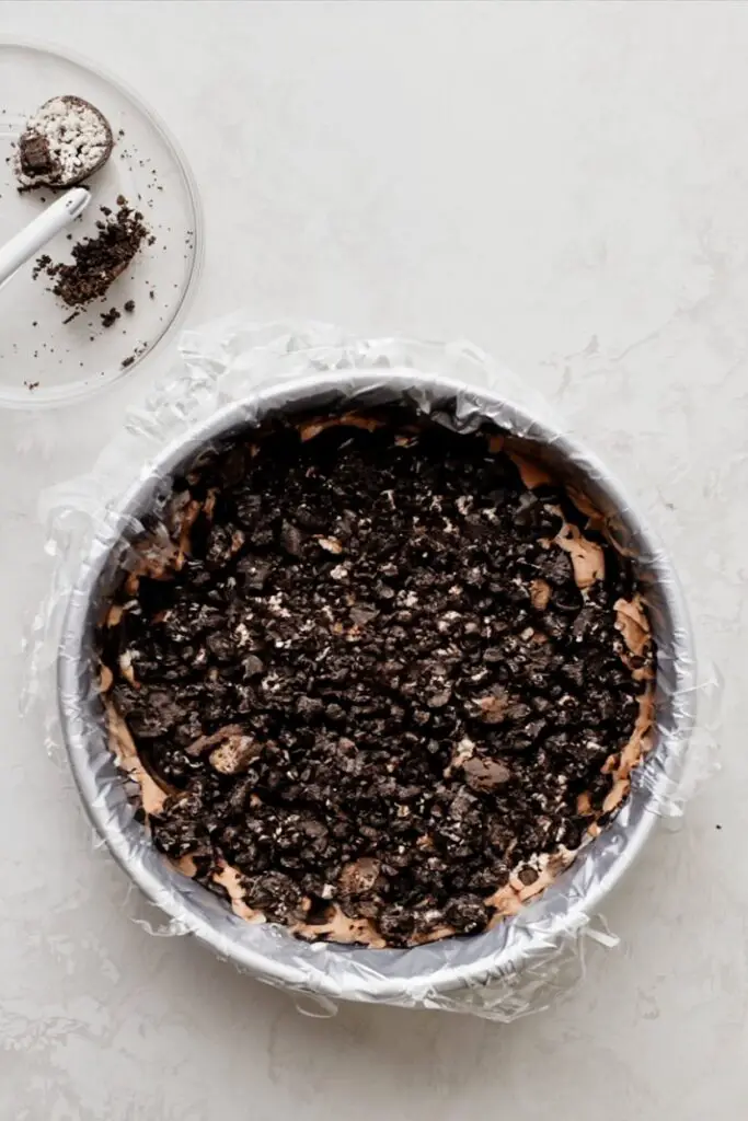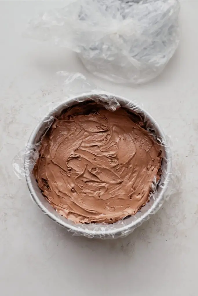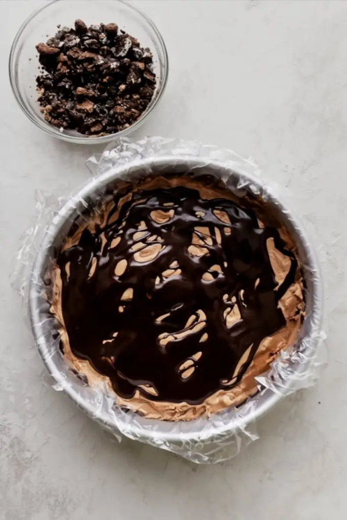 Take your chocolate ice cream out of the freezer to soften for about 10 minutes. While it softens, prepare your pan. Line a 9-inch or 10-inch springform pan with two overlapping pieces of plastic wrap, leaving some overhang on the sides. This will make it easy to remove the cake later. Working quickly, scoop the softened chocolate ice cream into the lined pan and use the back of a spoon to spread it into an even layer. Place the pan in the freezer for 30 minutes to firm up.