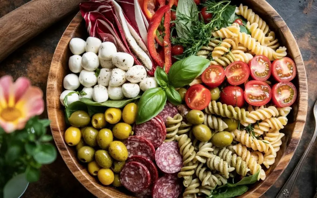- The Ultimate Make-Ahead Strategy: For maximum freshness at your party, prep the components separately. Cook and cool the pasta; chop all the meats, cheeses, and veggies (except the lettuce and basil); and whisk the dressing. Store them in separate airtight containers in the fridge for up to 24 hours. Combine everything about an hour before serving.
