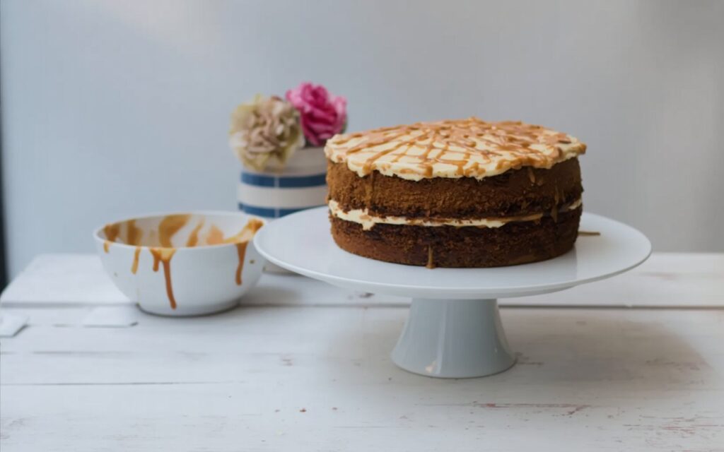 Sticky toffee pudding is typically a simpler, single-layer sponge cake served warm in a bowl, drenched in toffee sauce, often with ice cream or custard. This recipe takes those same core flavours and elevates them into a more formal, frosted layer cake that is stable at room temperature and perfect for slicing and serving on a plate.