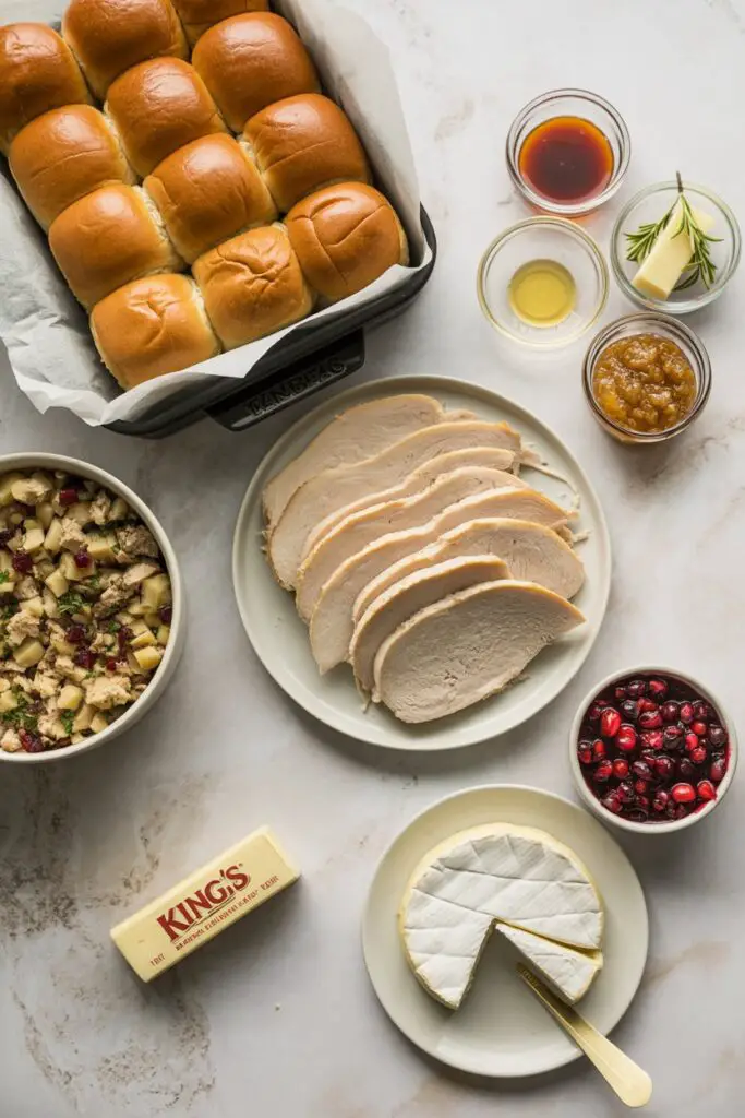 Build Sliders: Layer turkey, stuffing, cranberry sauce, and sliced brie over the bottom rolls.