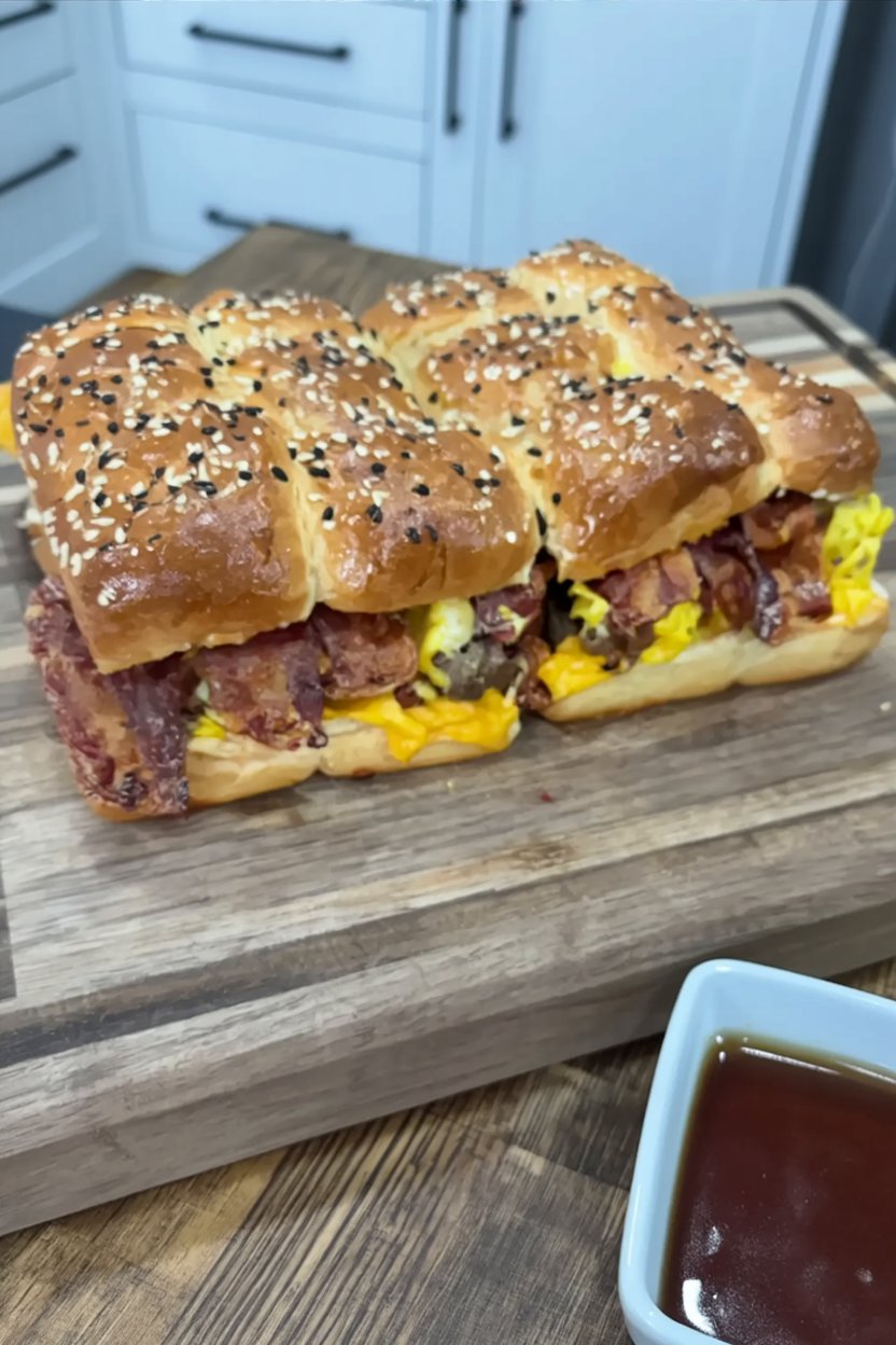 There is a reason why these Ultimate Breakfast Sliders have become a viral sensation and a staple in my kitchen. They manage to capture the essence of a full American breakfast—eggs, bacon, sausage, toast, and syrup—in one convenient, delicious bite. The contrast between the soft, sweet rolls and the salty, savory filling, topped with that crunch of bagel seasoning, is simply unmatched.