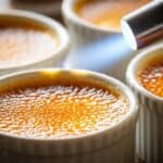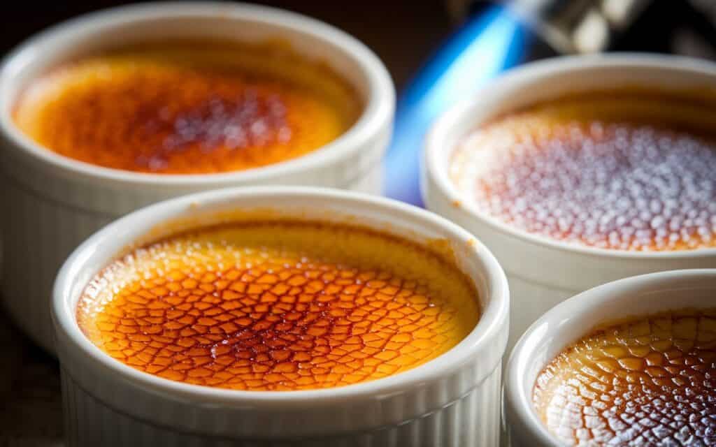 - Use a kitchen torch to melt and caramelize the sugar until it forms a crisp, golden crust. Alternatively, place the ramekins under a broiler for 2–3 minutes, watching closely to prevent burning.