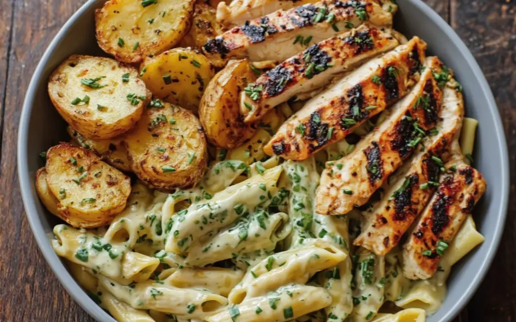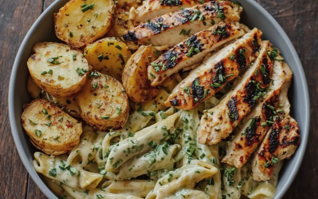 Ingredients You’ll Need. Juicy herb-marinated grilled chicken, crispy roasted baby potatoes, and al dente penne tossed in a silky pesto cream sauce—layered into one satisfying bowl.