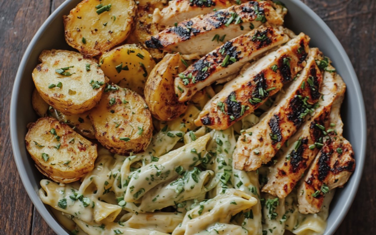 - Assemble bowls: Toss pasta with sauce. Serve topped with sliced grilled chicken and roasted potatoes. Garnish with extra Parmesan, herbs, or lemon wedges.