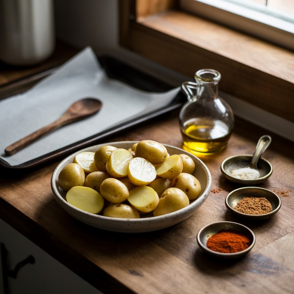 - Roast potatoes: Toss halved baby potatoes with olive oil, garlic powder, smoked paprika, salt, and pepper. Spread on a baking sheet and roast 20–25 minutes until golden and tender.