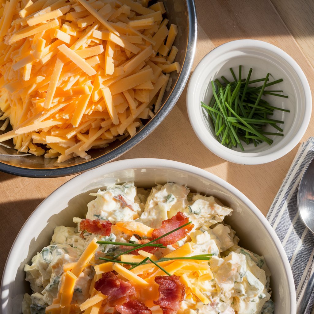 Gently fold the hot potatoes and chopped bacon into the dressing. Add shredded cheddar and sliced chives, stirring just until evenly coated. The residual warmth will slightly melt the cheese, creating those delightful cheesy strands.
