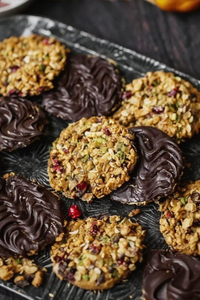 The secret to these cookies lies in the balance of textures—crunchy nuts, chewy fruit, and a sticky syrup binder.