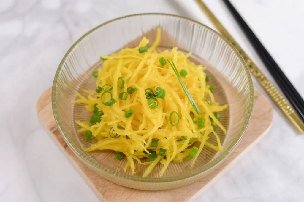 - Pour the warm scallion oil dressing over the roasted squash strands.